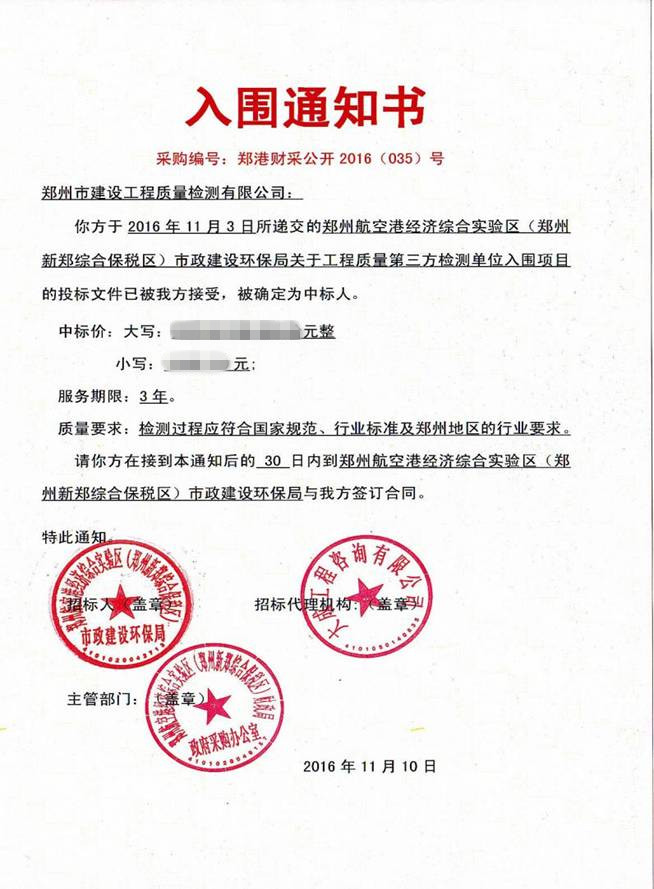 2016年10月12日,鄭州航空港經(jīng)濟綜合實驗區(qū)(鄭州新鄭綜合保稅區(qū))市政建設(shè)環(huán)保局發(fā)布《航空港區(qū)工程質(zhì)量第三方檢測單位招標報名公告》,我公司市場部高度重視,及時安排專人整理報名資料進行報名。